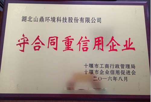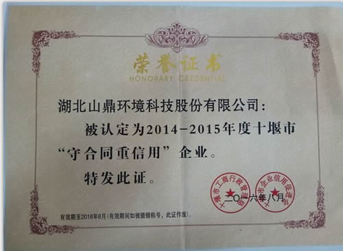 祝贺九球体育(中国)官方网站获评由十堰市工商行政管理局、十堰市企业信用促进会颁发的(2014—2015年度)“守合同重信用”企业荣誉证书。